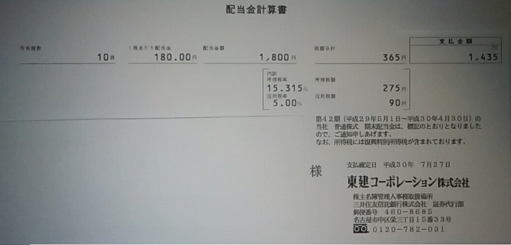 そんな東建さんから配当金の振込みありました。
